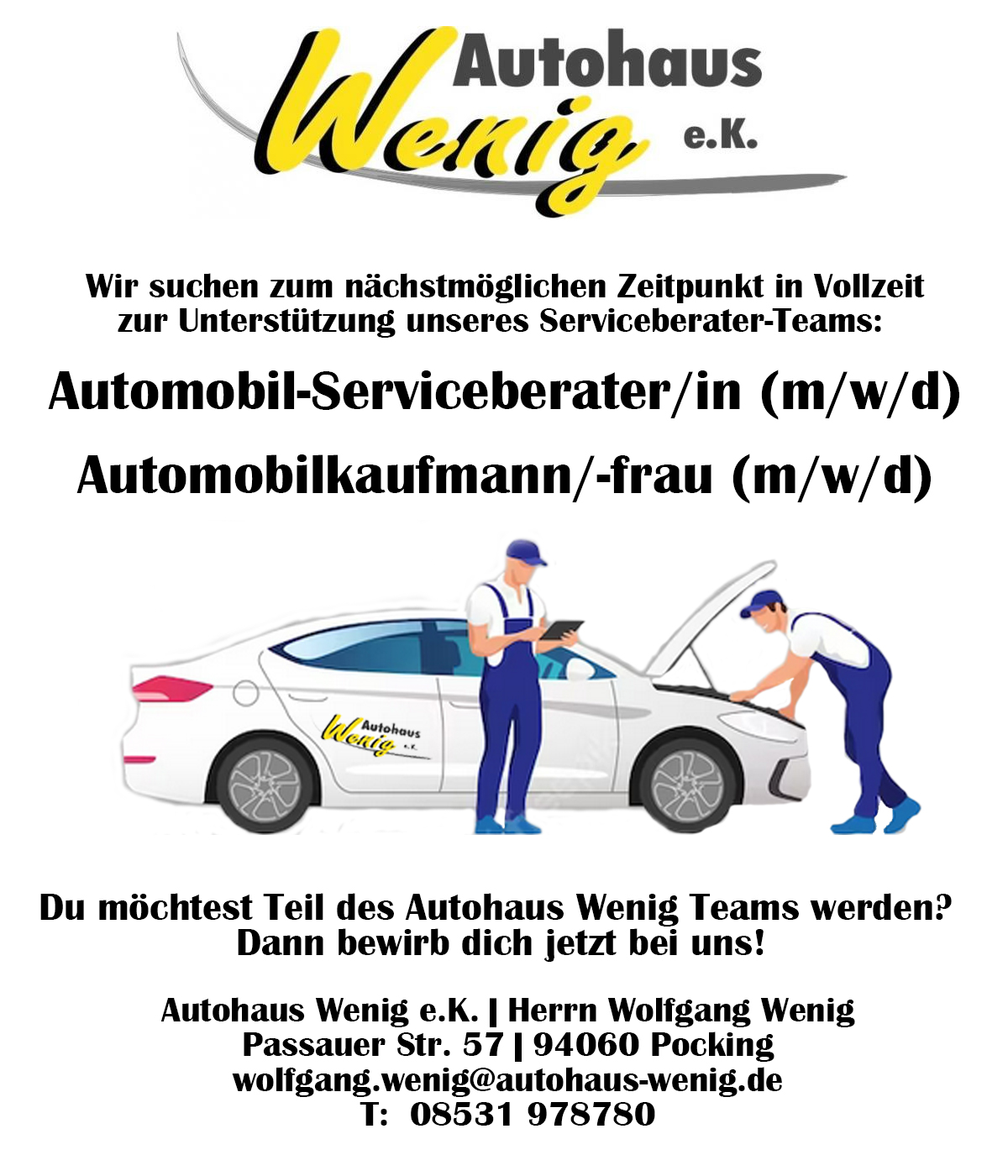 Wir, das Autohaus Wenig, sind ein traditionsreiches Familienunternehmen in der Automobilbranche in Pocking und vertreten die renommierten Marken Renault und Dacia. Zur Verstärkung und Unterstützung unseres Teams suchen wir derzeit nach einem engagierten und motivierten Serviceberater oder einer ambitionierten Serviceberaterin für unser Autohaus.