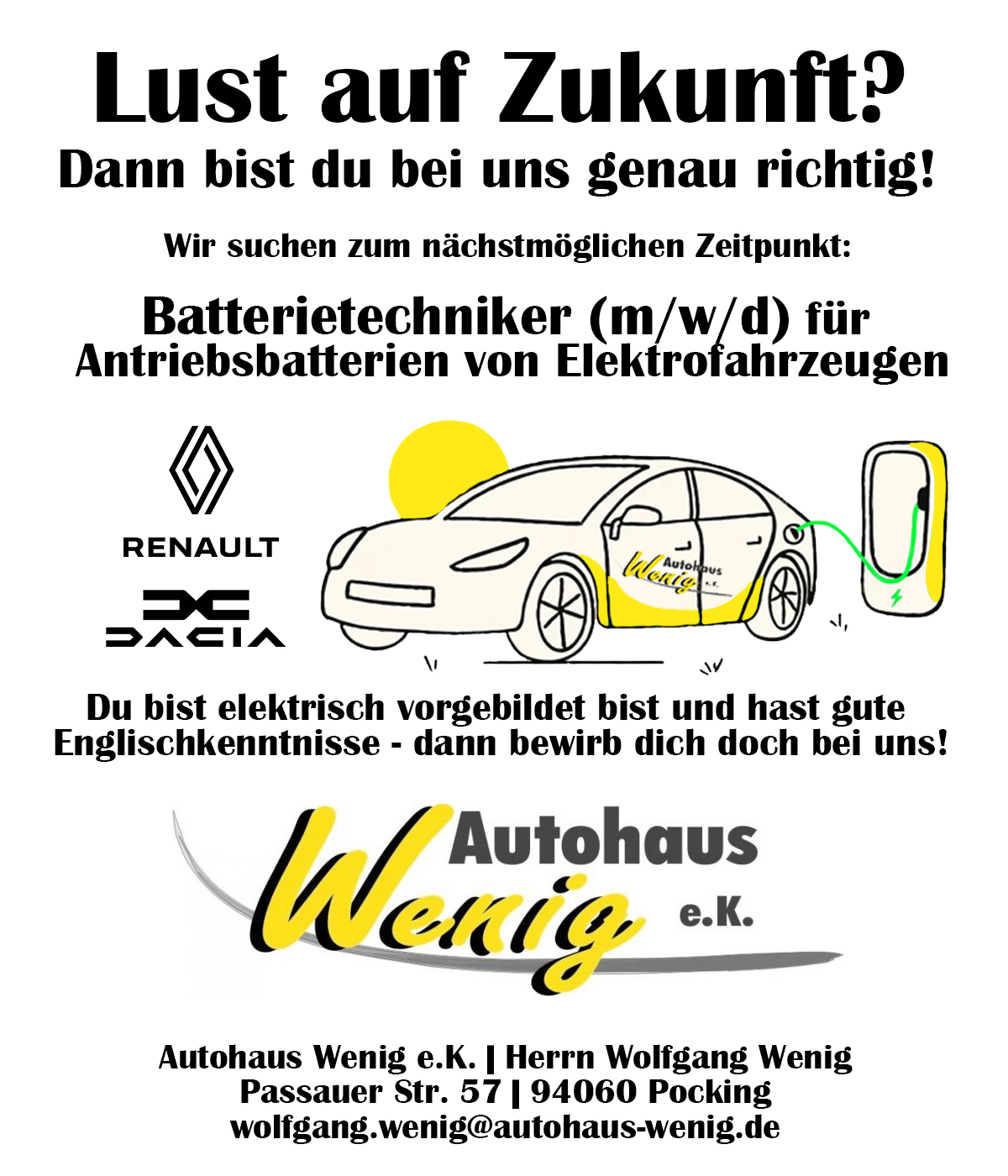 Wir, das Autohaus Wenig in Pocking, sind ein traditionsreiches Autohaus, bei dem Service und Kundenzufriedenheit seit über 70 Jahren einen sehr hohen Stellenwert haben. Wir gehen auch mit der Zeit und der Zukunft von Elektrofahrzeugen und haben vor einigen Jahren ein Batteriereparaturzentrum eröffnet, in dem wir Antriebsbatterien von Elektrofahrzeugen reparieren. Was hier klein angefangen hat, befindet sich in einem stetigen Wachstum.
