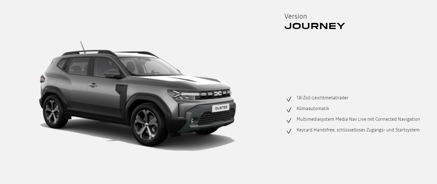 Neuer Dacia Duster HYBRID 140: Gesamtverbrauch kombiniert (l/100 km): 5; CO2-Emission kombiniert (g/km): 114; CO2-Klasse: C.