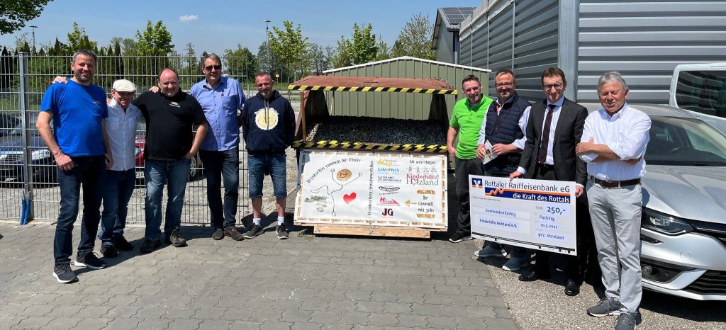 Die Pockinger Aktion fand in den sozialen Netzwerken auch unter dem Motto „ihr sammelts, mia zoin“ statt. Zusätzlich beteiligte sich die Rottaler Raiffeisenbank mit einem Scheck in Höhe von 250,- Euro. Samt Schrotterlös kommen so insgesamt rund 3600,- Euro für die Kinderhilfe Holzland zusammen. Die beteiligten Sponsorfirmen waren sich einig, jetzt nicht aufzuhören. Im Gegenteil. Der Container wird geleert und wir beginnen mit der zweiten Million – diesmal sollen dann über 4500,- Euro für die Kinderhilfe Holzland zusammenkommen, auch weil 2 Firmen mehr mitmachen wollen.