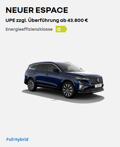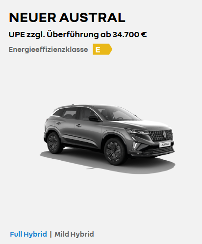 Für Kunden, die die Vorteile der Elektromobilität mit der Flexibilität eines Hybridantriebs kombinieren möchten, bieten wir die Full Hybrid-Modelle von Renault an. Dank der intelligenten Kombination aus Verbrennungs- und Elektromotor genießen Sie eine optimale Effizienz und reduzierte Emissionen im Stadtverkehr und auf der Autobahn. Entdecken Sie diesen Komfort z.B. mit dem Renault Clio E-Tech Full Hybrid, dem Renault Captur E-Tech Full Hybrid oder dem Renault Espace E-Tech Full Hybrid.