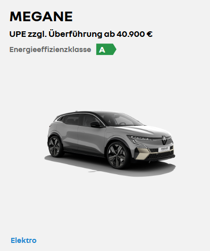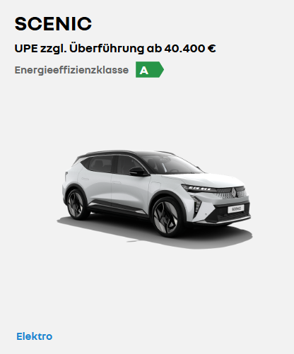 Die Renault E-Tech-Modelle stehen für eine neue Ära der Elektromobilität. Mit modernster Batterietechnologie und leistungsstarken Elektromotoren bieten sie eine emissionsfreie Fahrt und eine beeindruckende Reichweite, ohne Kompromisse bei Leistung und Komfort einzugehen. Erleben Sie die Zukunft des Fahrens z.B. mit dem Renault Megane E-Tech 100% Elektrisch, dem Car of the Year 2024 Renault Scenic E-Tech 100% Elektrisch oder dem Car of the Year 2025, dem Renault R5 E-Tech 100% Elektrisch.