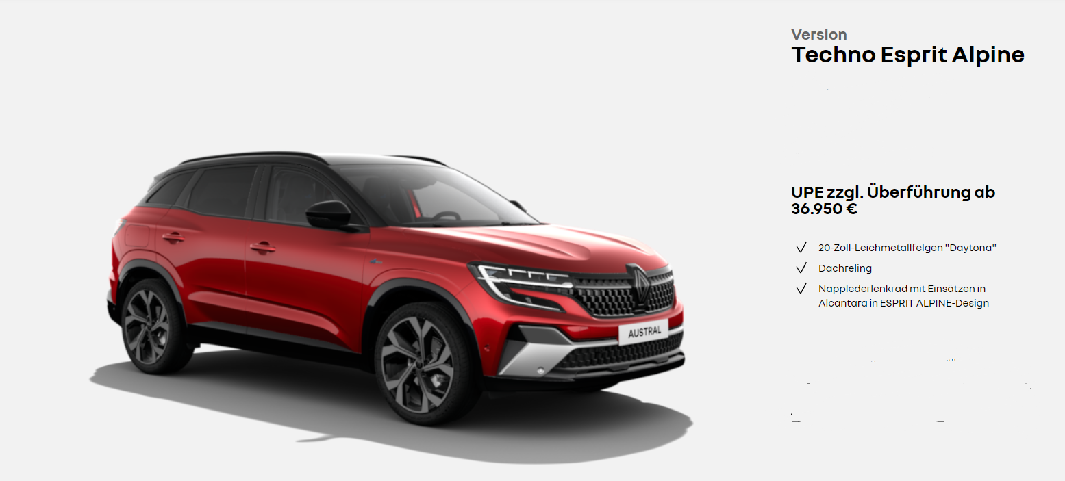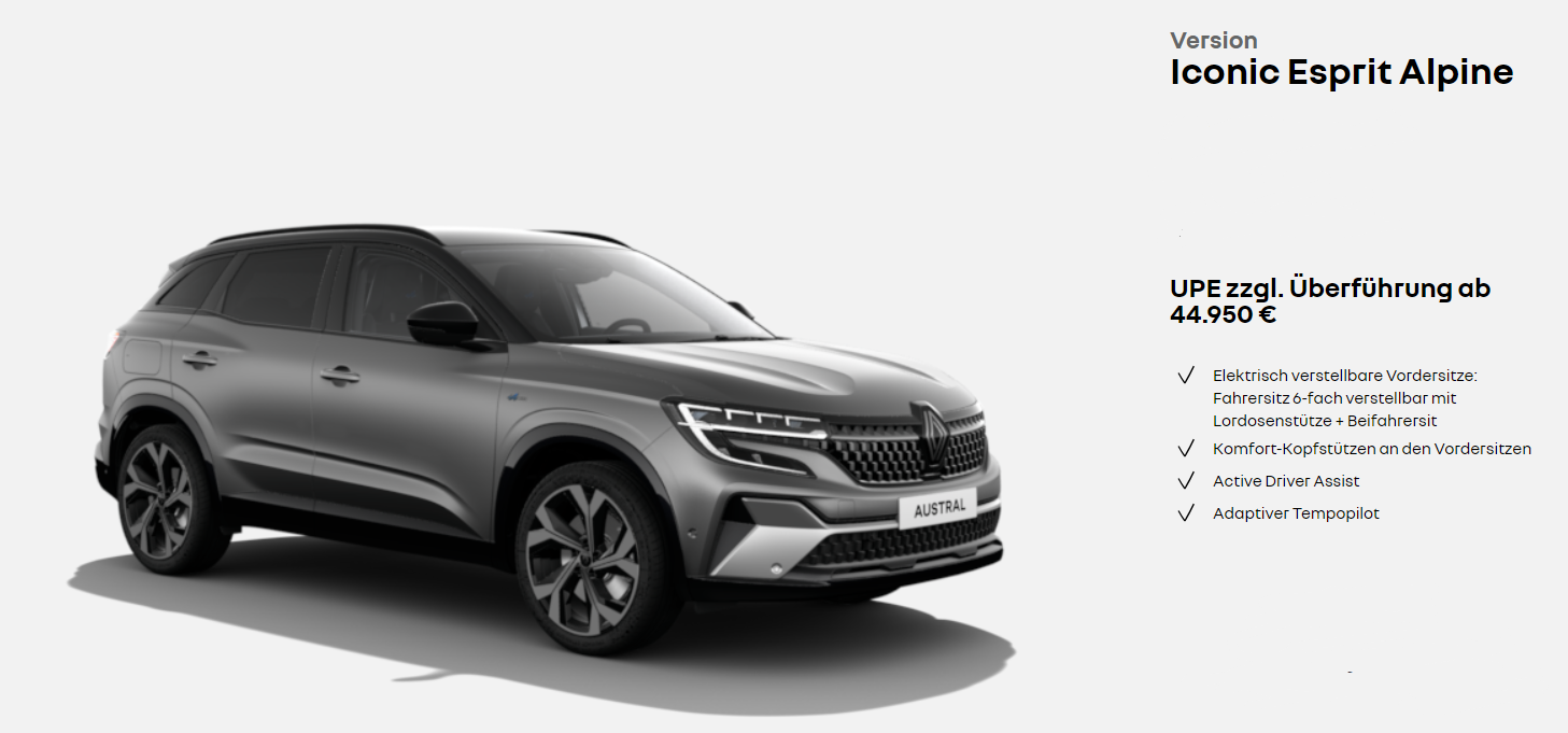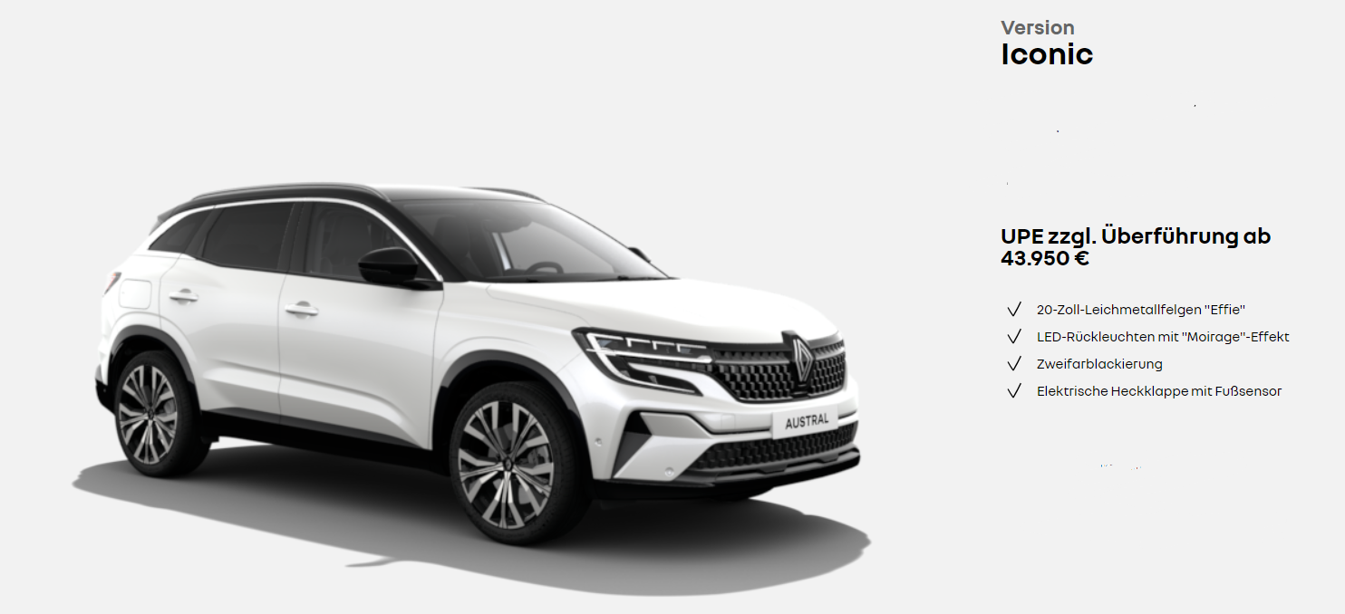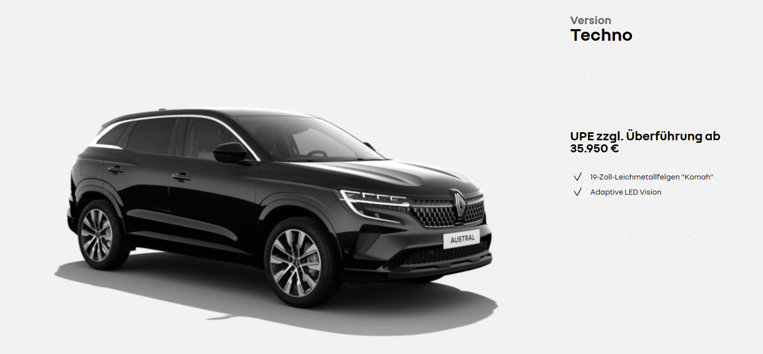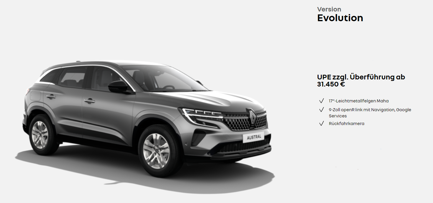 1 Renault Austral Evolution Mild Hybrid 160 Automatik: Fahrzeugpreis: 28.428 €.