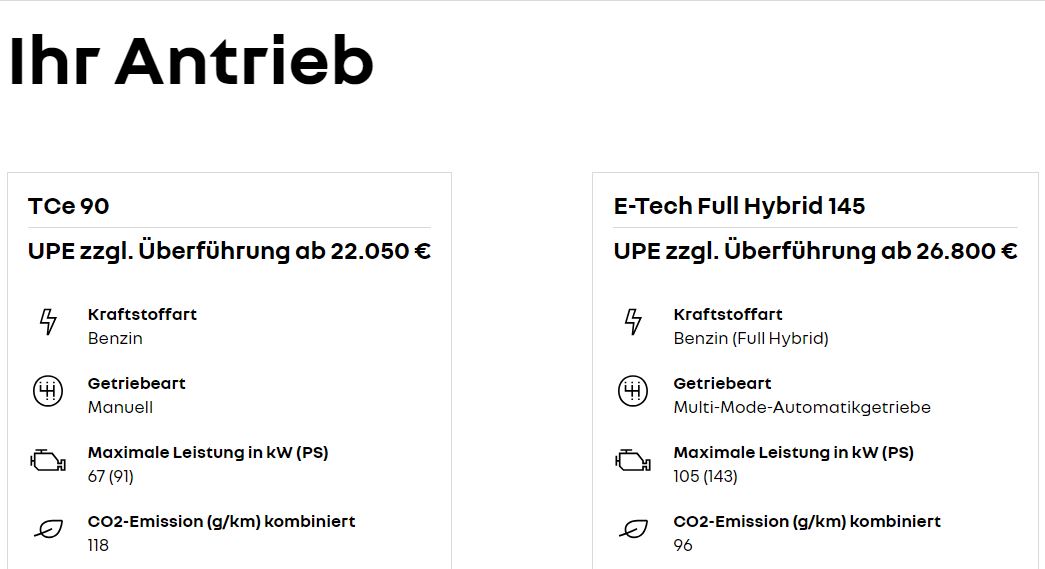 Renault Clio E-Tech Full Hybrid 145: Gesamtverbrauch kombiniert (l/100 km): 4,3; CO2-Emission kombiniert (g/km): 97; CO2-Klasse: C.