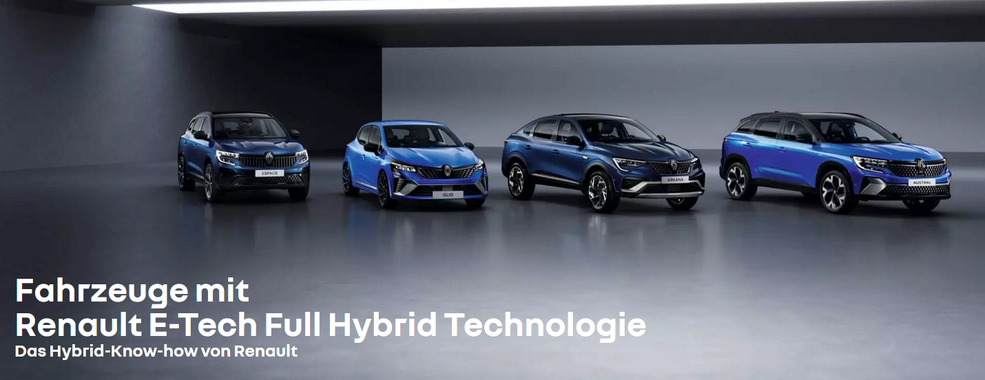 Renault E-Tech Full Hybrid Modelle sind mit 2 Elektromotoren sowie einem Verbrennungsmotor ausgestattet. Sie werden als „Serien-Parallel-Hybride“ bezeichnet, weil sie den vollelektrischen Betrieb, den hybriden Betrieb (Elektro- + Verbrennungsmotor) oder den reinen Betrieb mit dem Verbrennungsmotor ermöglichen.