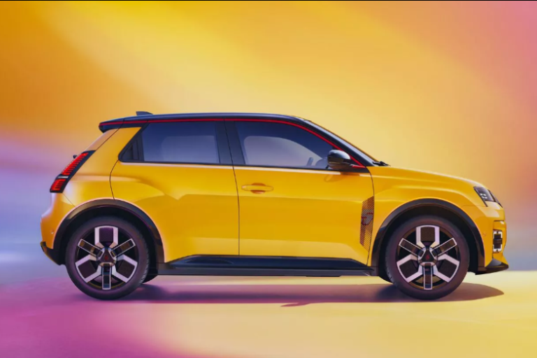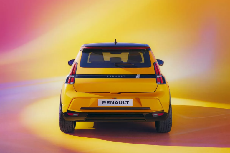 Die markante Silhouette des Renault 5 E-Tech 100% Elektrisch ist am steil abfallenden Heck und der Formgebung mit abgerundeten Ecken zu erkennen.