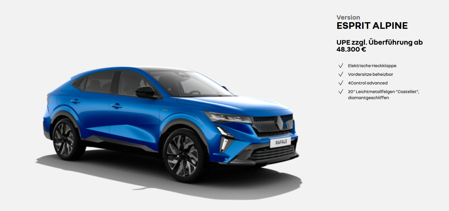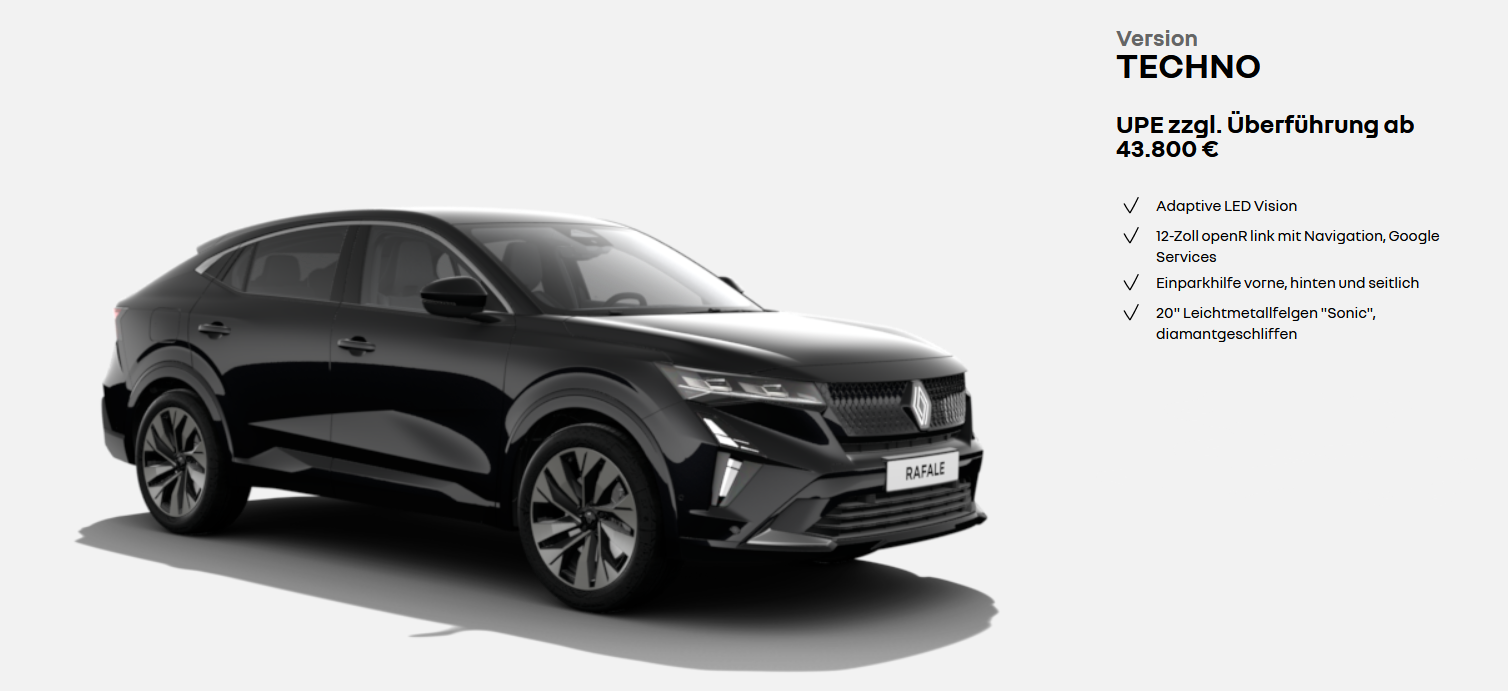 Renault Rafale E-Tech Full Hybrid 200: Gesamtverbrauch kombiniert (l/100 km): 4,7; CO2-Emission kombiniert (g/km): 106; CO2-Klasse: C.