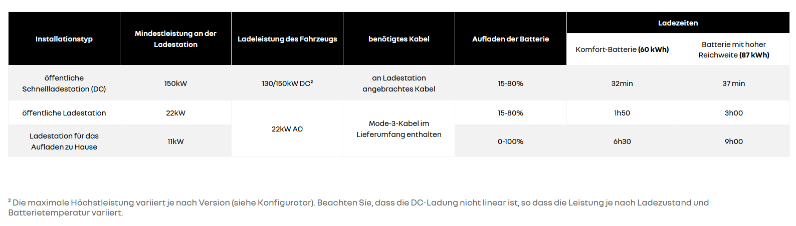 Ideal für lange Fahrten auf der Autobahn mit kurzen Stops: Laden Sie Ihr Fahrzeug an öffentlichen Gleichstrom-Schnellladestationen mit der an der Ladestation befestigten Kabeln.